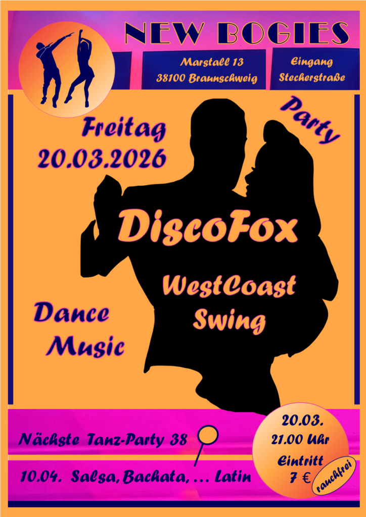 Am Freitag, 20. März 2026 startet die Tanz-Bar „New Bogies“ in Braunschweig um 21.00 Uhr eine Tanzparty. Wir legen auf und spielen Dance Music für DiscoFox, DiscoChart, … West Coast Swing. Freut euch auf gut gemixte Musik und lasst euch von uns auf die Tanzfläche ziehen.